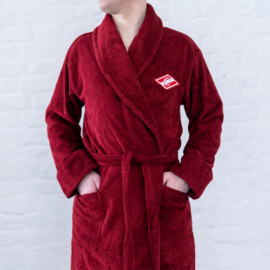 Бордовый махровый халат с вышитыми элементами: классическим логотипом на левой груди и словом "СПАРТАК" на спине.
